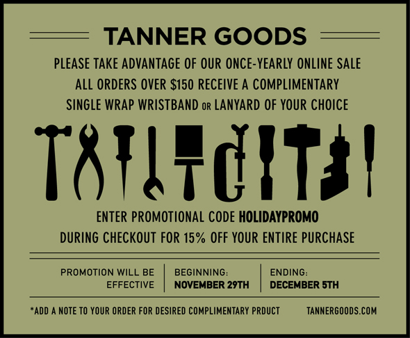 Finally, Tanner Goods is offering their annual holiday promotion; Simply enter the promotional code HOLIDAYPROMO during checkout, and receive 15% off your total order. As an added bonus, all orders over $150 are eligible for a complimentary single wrap wristband or lanyard of your choice. Customers may add a note to their order stating their desired product and color.